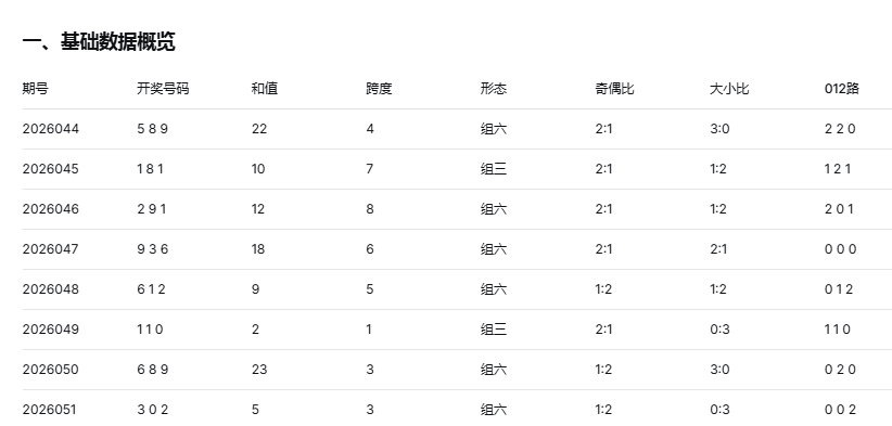 基于最近8期(2026044期-2026051期)开奖数据,本文将从分位走势、形态特征、和值跨度、数字频率及特殊现象等多个维度进行系统性分析,提炼出可循的出号规律,为彩民选号提供参考。