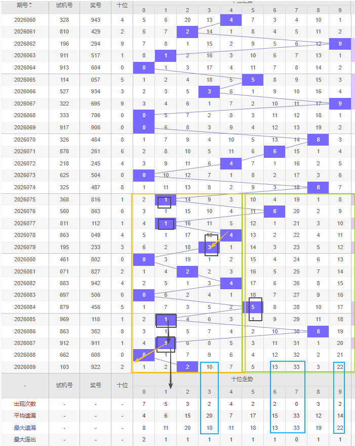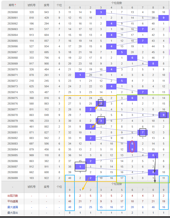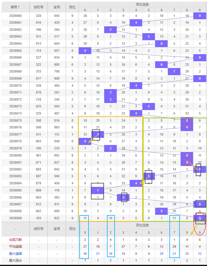 福彩3D第2026090期个位先分析奇数偶数,近十五期开出奇数号5期,开出偶数号10期,开出偶数号的概率比开出奇数号的概率大。近十余期都是奇数偶数间隔开出的,上一期又开出了偶数2号,本期还是看好增加奇数,建议考虑遗漏期数较大的奇数号,比如5号遗漏十期以上且达到平均遗漏期数和最大遗漏期数,都可以防冷号开出。隔断号可以考虑8号,本期若开出则形成2-1的形态,1号本期若开出可以作为上期开出的2号的邻号开出。