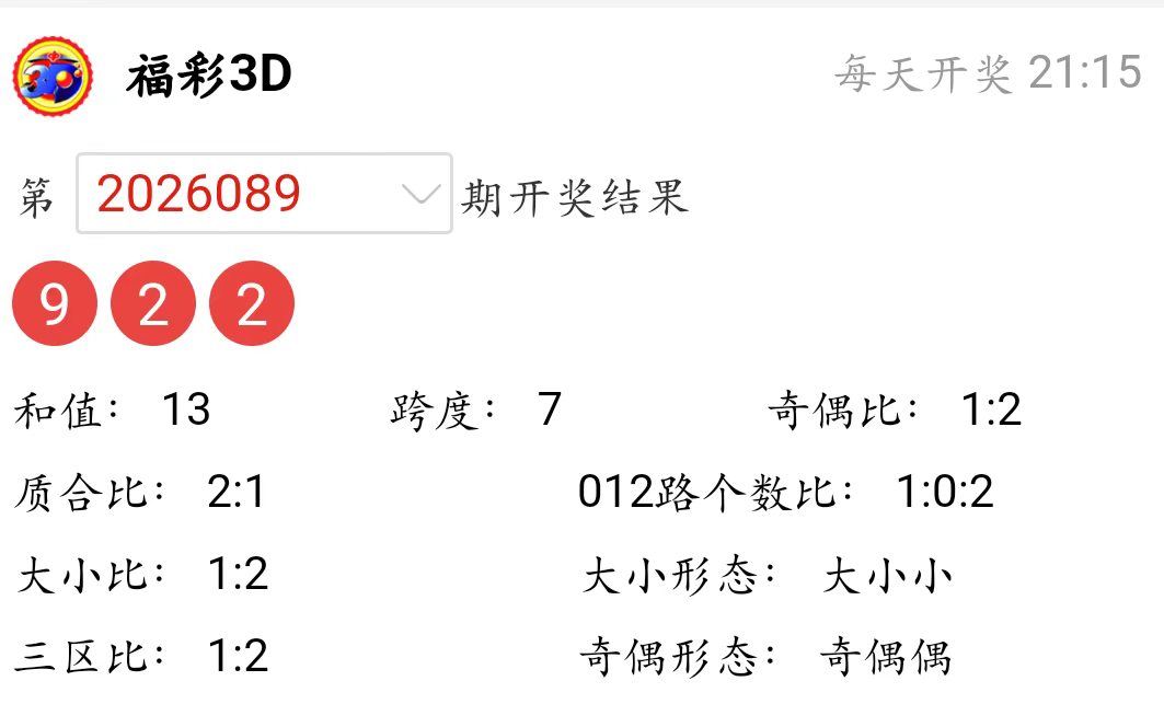 福彩3D上期(2026089期)开奖号码详情