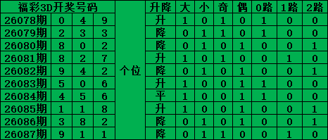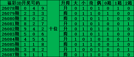 福彩3D是从0-9每期开出3个号码,截至2026087期三个位置最大遗漏的是38期的:个位的0号。