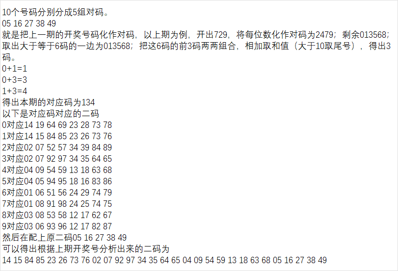 首先是把上期号码分别找出对应码和补码。再用第三期号码,斜线号码(上期百位,上上期十位,上三期个位),以及第十期号码,分别找出其对码和补码。最后再找出和上期号码的补码相同的号码来作为本期的胆码。如果相同的号码只有1个,可以用其对码和补码来补全为四码的胆组。以上期为例: