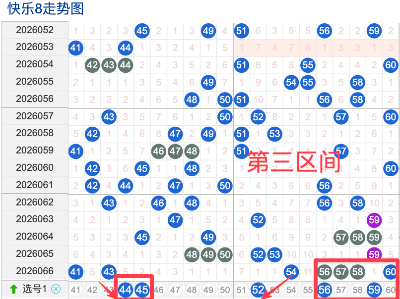 三区间开出了7个奖号(41.43.54.56.57.58.60)上期回顾三区开出7个奖号上期的三区间的奖号数量呈现一个递增的形态,4头回补2码,本期先来看号码44期出现频率相对来说还是很稳定。偶尔有时间隔期数也是很长,但是在近期的开奖中较温热,号码45在近 30 期内出现次数相对较稳定的号码,近期的活跃度也是较温热。号码52有一定的间歇性,通常间隔5-3期会出现一次,没有明显的连续出现态势,走势相对还不是很稳定,在整个第三区间的表现本期还是可以防守的。号码56走势相对近期较热,近期没有连续间隔落号的情况,活跃度近期处于热状态注意防守。