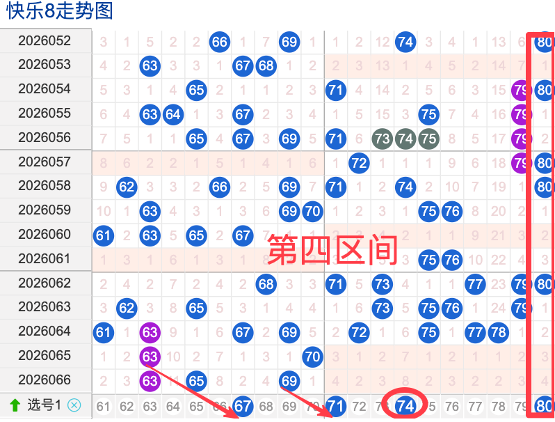 上期四区间开出了3个奖号(63.65.69.)上期的四区开3个奖号呈现了一个递增趋势,开出的奖号6头回补3个号,7头断码,先来看号码67在近 30 期内属于还是很稳定的号码,近期出现频率相对热,偶尔会间隔多期后出现一次,这个号码要注意防守,号码71具有一定的间歇性近期活跃度还是很稳定比如有时会间隔3到5期就再次出现,也有时会间隔多期,近期整体出现频率比较热,近期还是要关注的.号码74活跃度近期比较温热,有一定的间歇性。活跃度近期较一般,整体走势有一定的波动性.