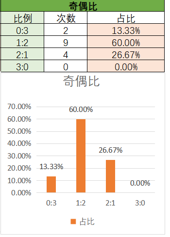 上期奇偶比为0:3,各个类型占比没有变化。近15期内1:2,2:1优势最好,最后是0:3。上期开了0:3奇偶比,本期看好2:1奇偶比的开出,其次是1:2。