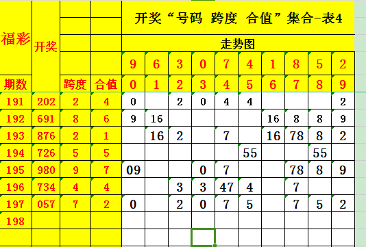 (四)搭建一个由“开奖号码、跨度、合值”组成的走势图,把数字0123456789十个数字按规则排列,见下表4;​