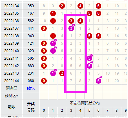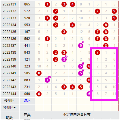 上图就是近期福彩3D二码合图表,这个是任意二码合,通过图表就可以发现,在福彩3D里从138期开始一直到到144期,任意二码合为7、8、9的数据已经来到了6期未开,这个就是暗示着大家,近期这个指标一定要开出,那么一旦开出中指标,就会精简太多号码,从1000注直接杀掉几百注。