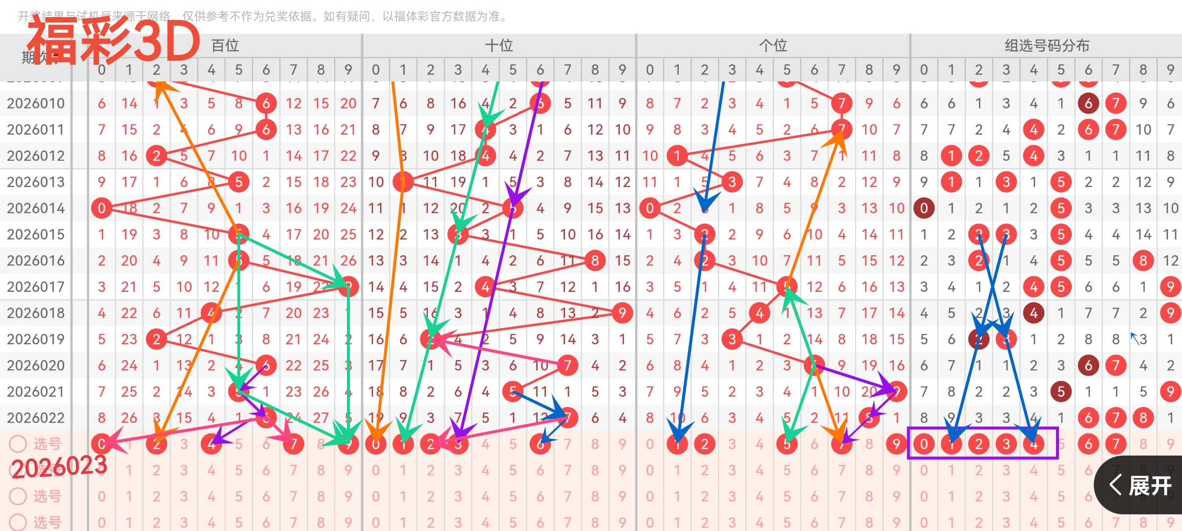 百位近期走势:上期开出0路质数6,近期开的都是热码,现在冷号就1378都在走冷超过15期,大号7本期需要关注起来,出一期质数开出合数本期也得考虑质数, 如上图看紫色箭头5/6/4走回头路线,再看绿色箭头59/59,再看黄色箭头2/5/2斜线下来,红色箭头26560等隔下来,再就1路的147需要回补。综合上图百位推荐:02479