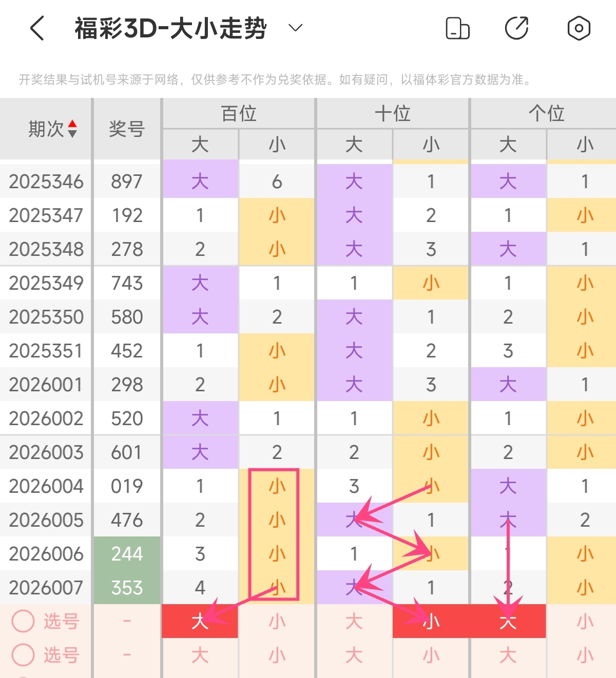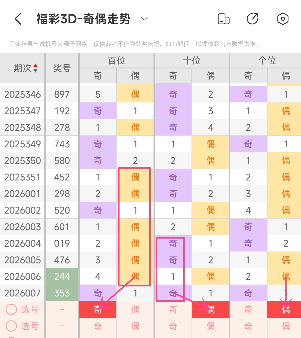 首先让我们回顾一下上期福彩3D第2026007期开奖号码为353 ,为组三形态,大小比为1:2,奇偶比为3:0,跨度为2,和值为11。