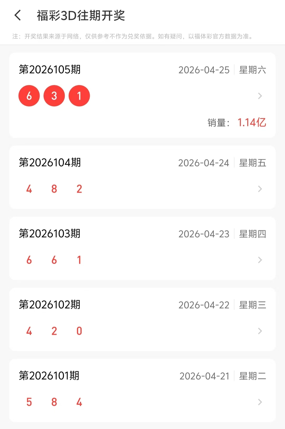 福彩3d2026年4月25日第105期,开奖号码是631,和值10,跨度4,偶奇奇,大小小,组六形态