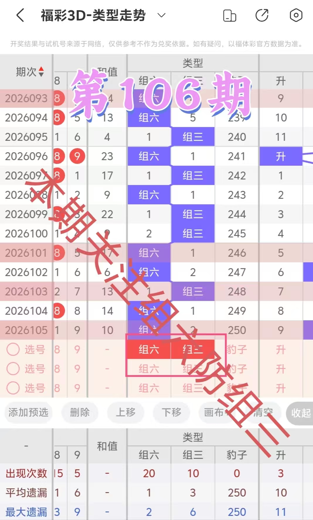 上期形态为主 六,近5期组六出现4次,组三出现一次。综上所述,下期福彩3d形态为:组六大于组三。