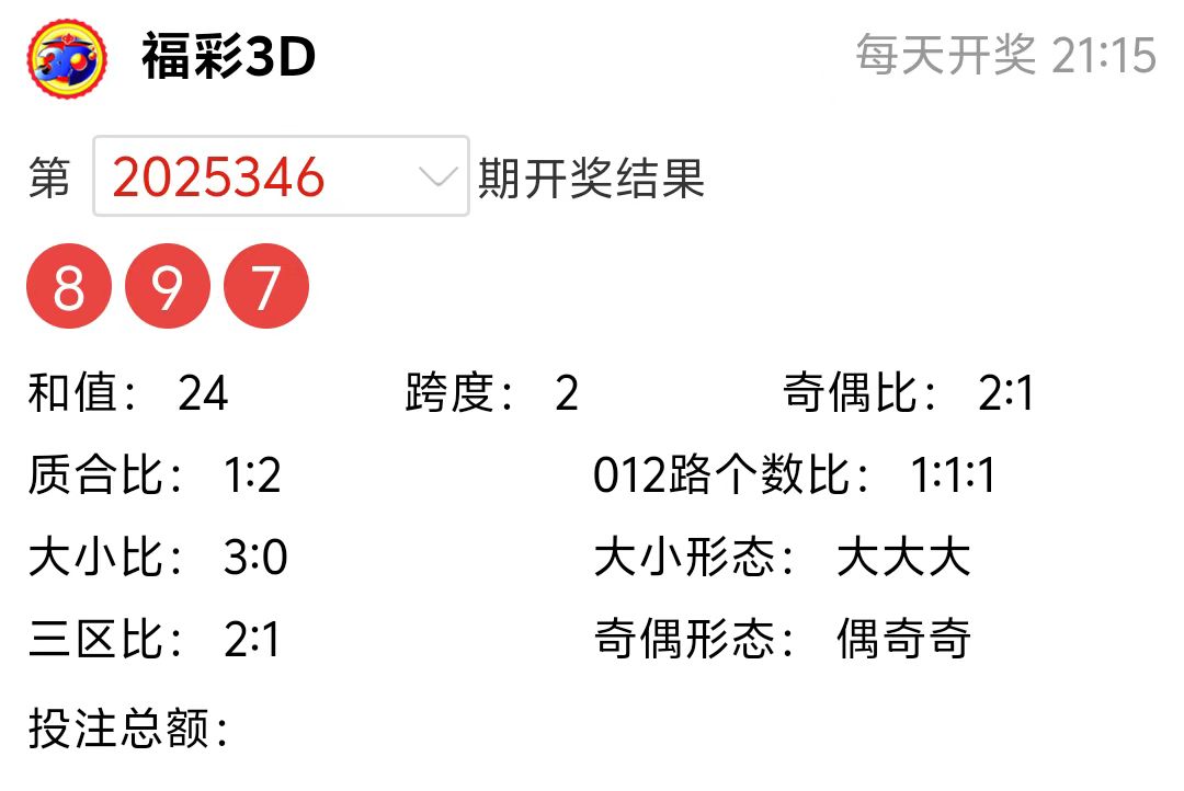 上期开出两奇一偶8、9、7,和值:24,跨度:2,奇偶比:2:1,质合比:1:2,大小比:3:0, 012路个数比:1:1:1