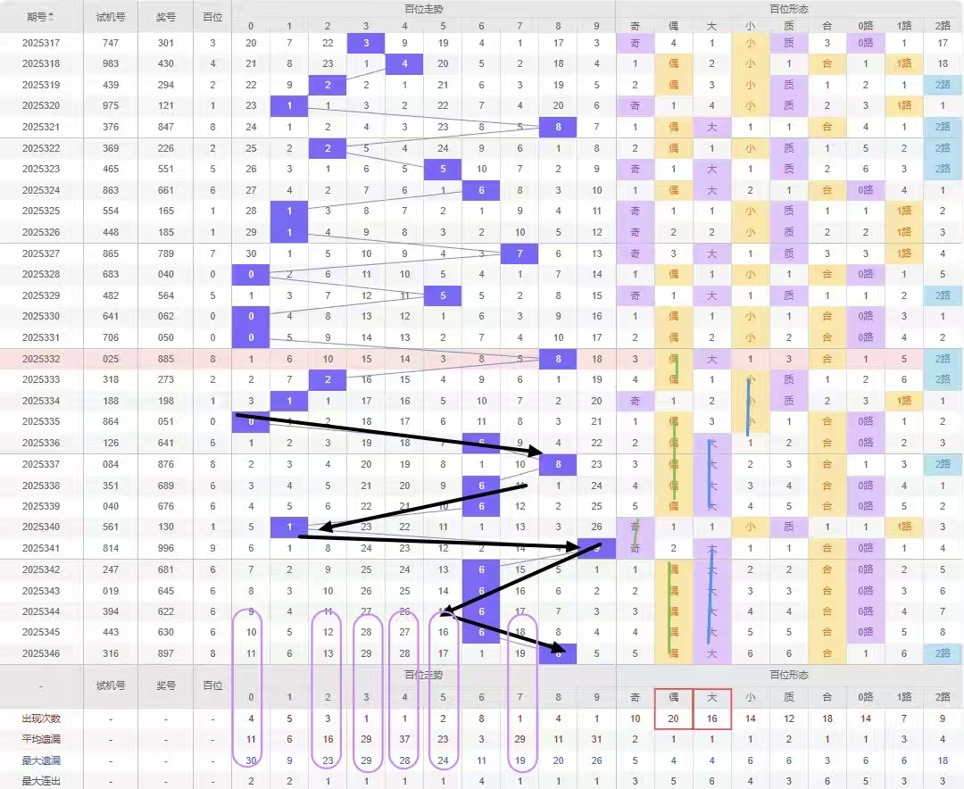 同理分析本期百位奇偶数形态,可以看到近15期开出奇数号3期偶数号12期,开出偶数号的概率是开出奇数号概率的4倍,上五期开出偶数号那么本期继续开出偶数的概率上升建议选择遗漏期数较大的偶数号。杀号建议定在所有奇数号,但奇数号3号、5号、7号都已经遗漏了10期以上建议开出防冷号开出。