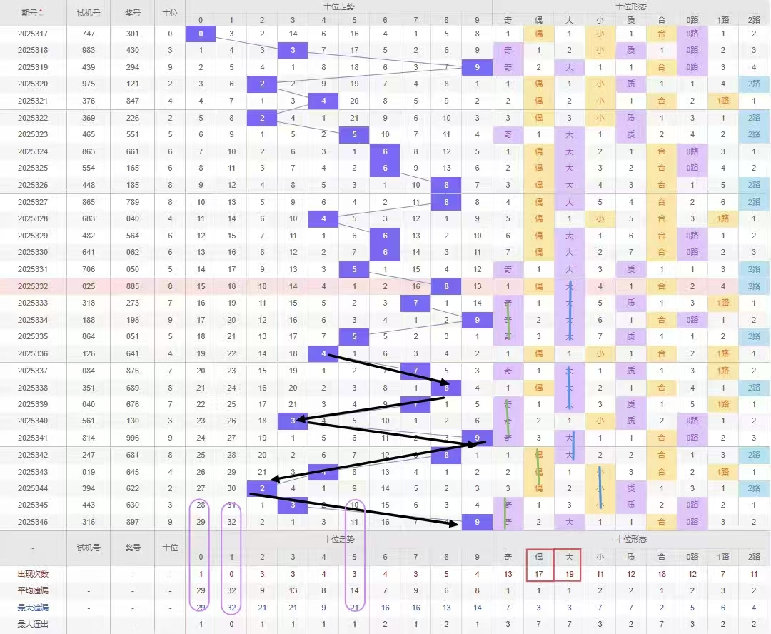 十位大小号从开出次数概率分析,近15期开出大号10期开出小号5期,开出大号的概率是开出小号概率的2倍,上期开出大号那么本期继续开出大号的概率较大建议选择遗漏期数较多的大号。杀号建议定在所有小号,但小号0号、1号都已经遗漏了10期以上建议开出防冷号开出。
