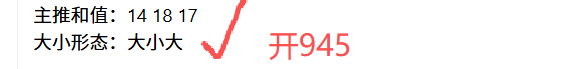 首先来看上期开奖号码为:945,和值为18上期推荐大小大对,和值18对等