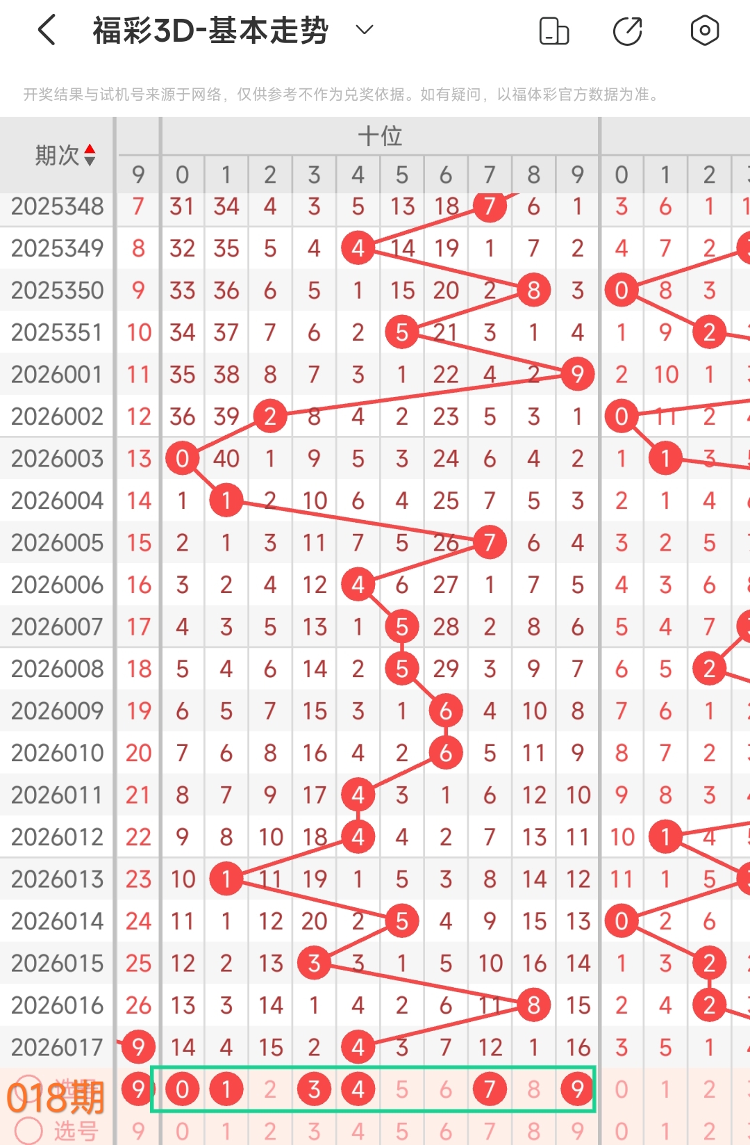2、当十位开出4后下期开出:9789826728541,经统计0号出0次、1号出现1次、2号出现2次、3号出现0次、4号出现1次、5号出1次、6号出现1次、7号出现2次、8号出现2次、9号出现2次。观察发现2789号出现频繁,本期可以考虑。