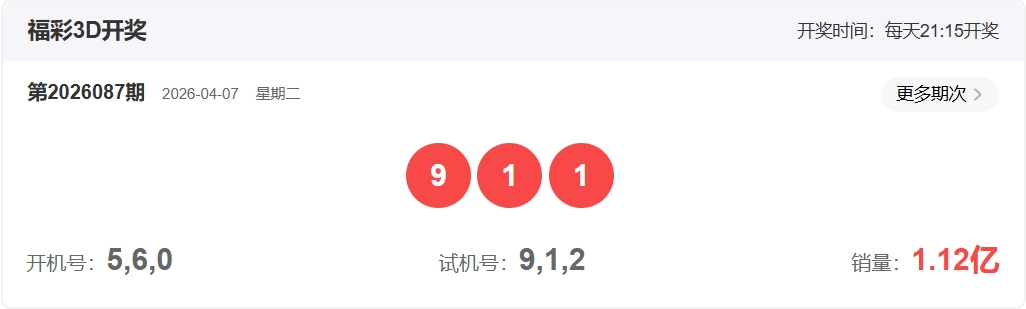 福彩3D第2026087期开奖911