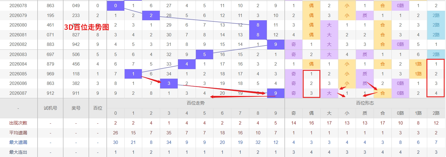福彩3D百位分析:第2026087期百位开出号码9属于大奇数,从上面百位走势图上可以看出近100期大小比约为48:52奇偶比约为55:45。近期数据还是比较极端的符合文章开头介绍的求均衡规律非等量现象。但这种均衡不会持续最终会被偏态运行打破,然后循环往复。但短期内大小相差6点,小数过热大数有回补需求本期个人认为走大数的概率更高。上期百位落号“9”号球,在百位号码开出0路号码9后向大数方向走出6个振幅。那么通过分析上期百位落位号码分析,号码走出6个振幅,号码走为大奇数,开出0路号码9。通过对百位落号趋势来分析,百位号码落位后端,通过对近10期的走势来看百位号码大小交替频繁走3期大数又走2小数,近期3D百位走势中,数字3虽然刚刚开出,但其此前经历了较长遗漏周期,积累了较强的回补动能,往往冷号解冻后容易出现连下走势,尤其在当前出号节奏偏活跃的阶段,3的重复开出概率并不低,需重点留意;而数字2则作为近期热号,出现频率稳定、间隔紧凑,属于百位上持续有表现力的号码,虽然热度高,但正因如此,其顺势再出的防守价值依然存在。我们在百位关注的重点在04568这5个号码球上,百位号码近期奇偶切换频繁,9号球码属于0路号码奇数,现奇数开出过多有向偶数的趋势。所以福彩3D第2026088期百位看04568。本文由一起彩钱是生命动力所著,请勿转载