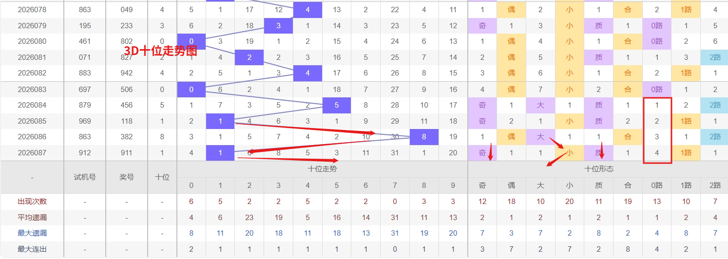 福彩3D十位分析:第2026087期十位开出号码1属小奇数号码前端。以历史100期数据为例十位奇偶比约为46比54,大小比约为45比55近期大小相差7点,根据求均衡的规律开出小数的概率比大数高一点。上期我们分析偶数经过连续回补后有走奇数的可能,开出奖号1小奇数符合我们的预期,近期3D十位走势来看,数字0表现极为活跃,连续或密集开出,属于典型的热号范畴,热号往往具备越热越出的惯性特征,短期内仍有继续连下的可能,需作为重点关注对象;与此同时,数字7则已进入明显的冷态区域,遗漏多期未出,远超平均间隔,从号码回归的周期性规律分析,冷号在积累足够大的遗漏幅度后,往往会逐步进入回补敏感期,随时可能出现反弹走势,同样不可忽视。所以福彩3D第2026088期十位推荐02679。本文由一起彩钱是生命动力所著,请勿转载
