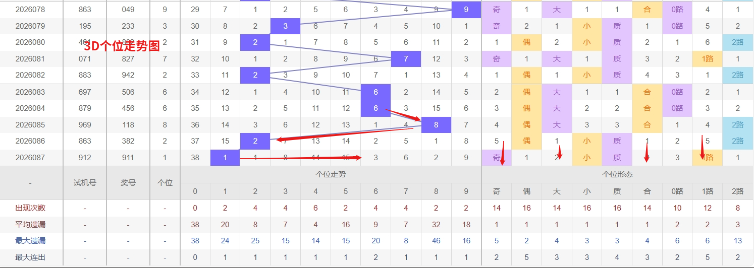 福彩3D个位分析:第2026087期个位开出号码1属于小奇数前端,从以上个位走势图中可以看出近100期的大小比约为48:52奇偶比约为55:45大小奇偶数据上有点差异有需求但不是太明显,不太好看这时就要借助连线走势和遗漏数据来帮助我们缩水号码。上期个位落号“1”小奇数1路号码球,号码开出了1振幅,连续多期的小振必被大振幅取代幅符合我们的预期,那么本期我们在个位考虑振幅走势走前依然要转变思路考虑大振幅,具体考虑(2-6)个振幅是我们主要的方向,那么在对个位落号情况进行系统的分析时我们可以明显的看到个位号码走势呈现大范围震荡,尤其是在号码的落位特点上表现的尤为突出,那么本期我们在个位分析时就要注意号码的风险,避免出现踏空。近期3D个位走势来看,数字0已处于明显的冷态区域,遗漏多期未出,远超平均间隔,从号码回归的周期性规律分析,冷号在积累较大遗漏幅度后往往会逐步进入回补敏感期,接下来需重点关注个位0随时出现的反弹走势,其回补动能不容忽视;与此同时,数字6则表现十分活跃,近期出现频率显著偏高,属于典型的热号范畴,热号通常具备越热越出的惯性特征,短期内难以迅速降温,同样需要作为重点防守对象。因此福彩3D第2026088期个位看好02679。本文由一起彩钱是生命动力所著,请勿转载