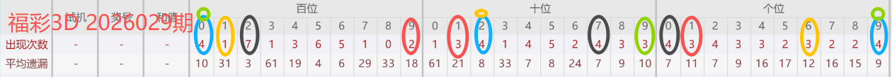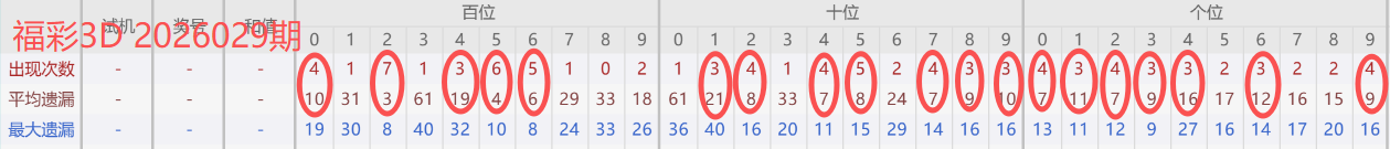 2026026期开奖号码099,我们可以看出近30期百位0出现4次,十位9出现3次,个位9出现4次。
