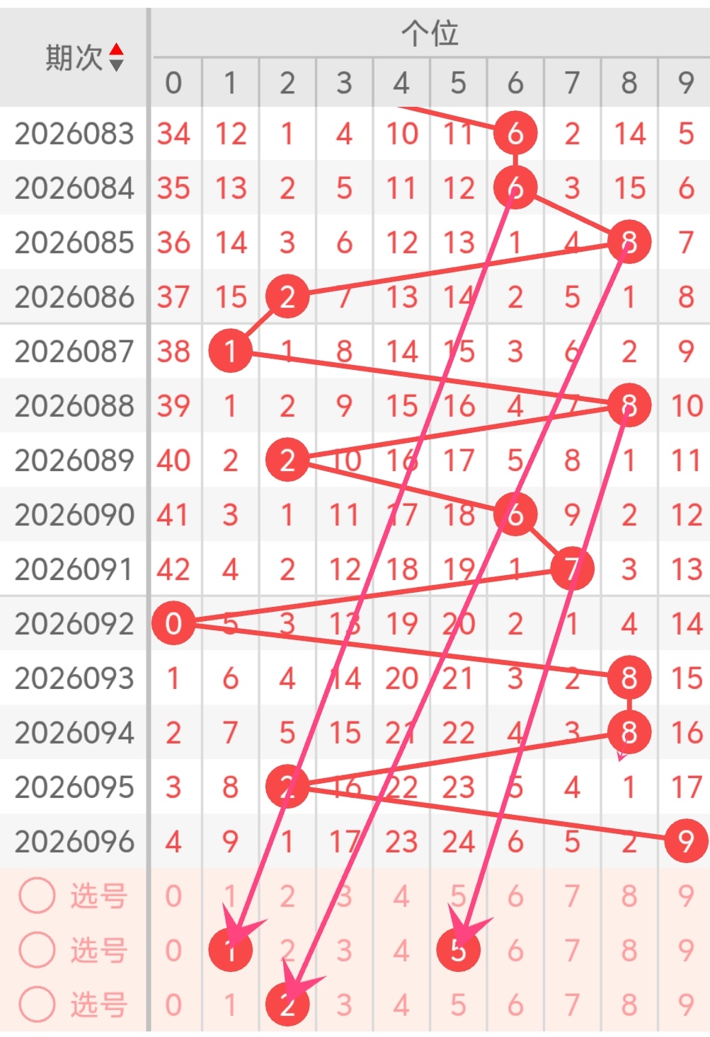 前段时间大号热出明显,偶数走势偏强,连号现象偏多,近期走势逐渐降温回落,中小号码遗漏周期拉长,奇偶形态急需轮换调整。十位跨度起伏收缩,区间走向平稳,冷热号码逐步均衡。综合形态、遗漏、大小奇偶分析,再结合延伸法,本期十位锁定七码:1、2、3、4、5、6、8。主打中小跨度号码,以温号衔接走势,适当弱化大热数字,奇偶穿插分布,修复区间冷热失衡,让百位十位形态搭配更加协调。