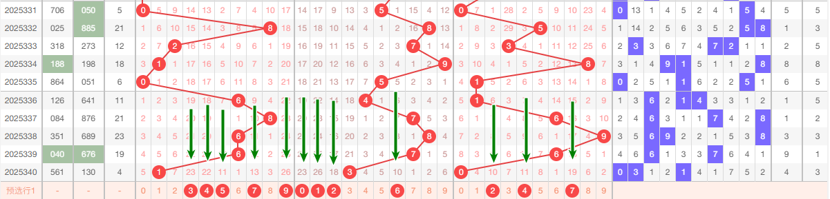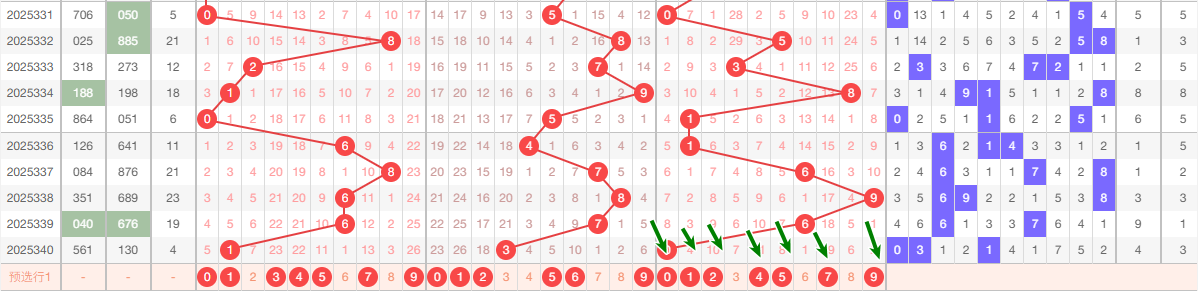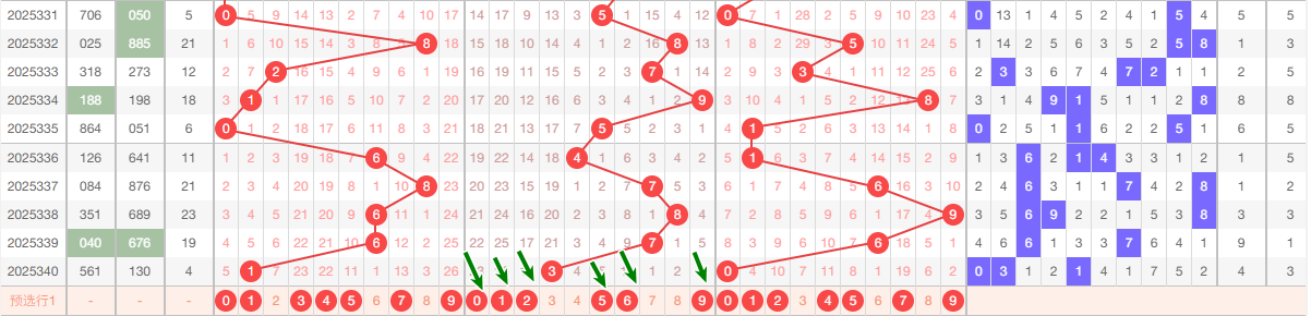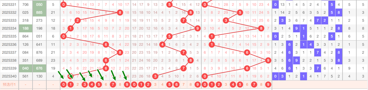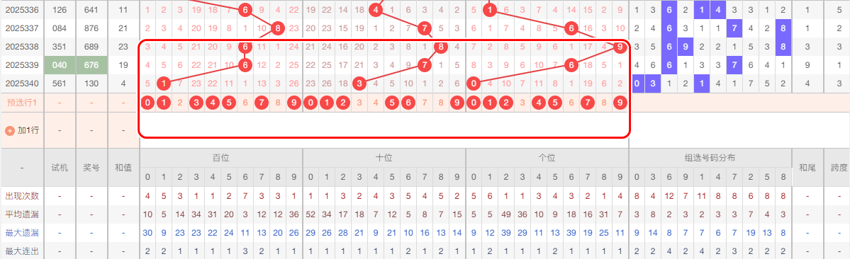 如图所示   上期百位开出1,本区与上期的跨度为5,本期我们可以从上面走势图中看出选号的思路,本期百位推荐关注:0134579