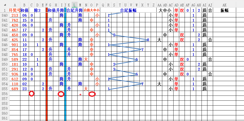如上图3,和值升降平分析,和值升概率大,小于23和值