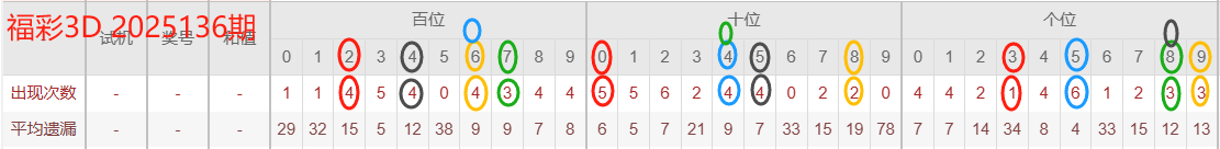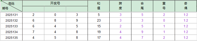 2025131期开奖号码203,我们可以看出近30期百位2出现4次,十位0出现5次,个位3出现1次。