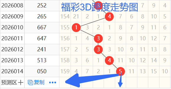 2)我们来看跨度;还是以010期——014期为例,如图依次是13345跨度,按照路数转换关系来看,那么跨度我们暂定258369跨 ,本期个人比较看好 5 0跨。