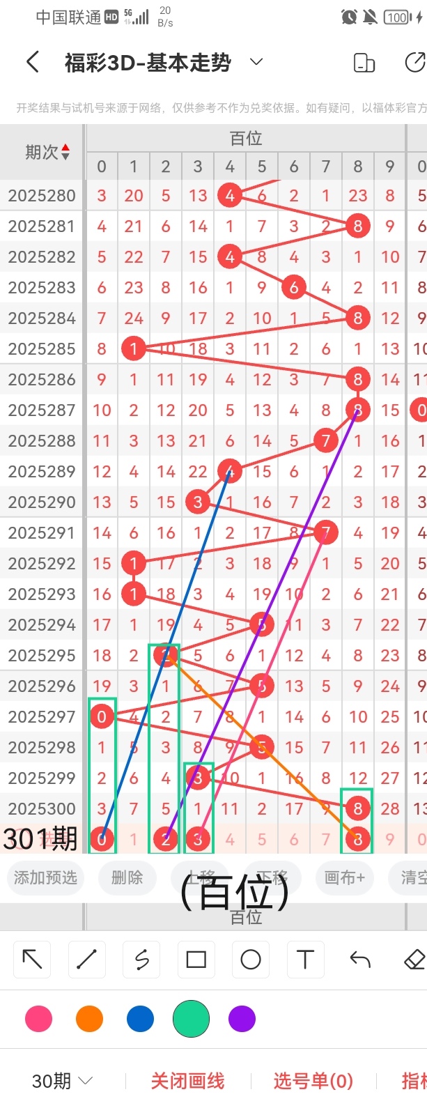 首先,小梁给大家分享每期福彩3D杀一百位:6;准确率高达95.36%。其次,我们根据图中画线的思路可以看出,号码0与前几期开出的号码呈隔三期回补的走位且呈斜三连的走势,跨度为8;号码2与前几期开出的号码呈斜三连的走势且呈隔五期回补的走位,跨度为6;号码3与前几期开出的号码呈斜三连的走势且呈隔期回补的走位,跨度为5。然后,如图所示,号码8与前几期开出的号码呈直连回补的走位且呈斜三连的走势,跨度为0。综上所述,小梁推荐百位的号码:0、2、3、8。