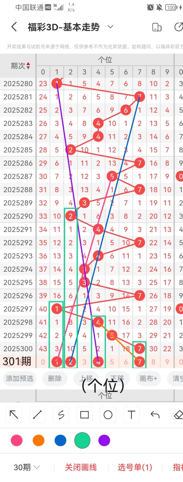 首先,小梁为了感谢各位老板的关注和打赏,特提供一个杀个位的小技巧,同尾杀号法,准确率相当高。根据同尾杀号法,得知本期杀个位1。其次,我们根据图中画线的思路可以看出,号码1与前几期开出的号码呈斜三连的走位且呈隔三期回补的走势,跨度为6;号码2与前几期开出的号码呈斜三连的走势且呈隔十期回补的走位,跨度为5;号码4与前几期开出的号码呈斜三连的走位且呈隔两期回补的走势,跨度为3;号码7与前几期开出号码呈直连回补的走势且呈斜三连的走位,跨度为0。综上所述,小梁依据图中画线思路推荐个位的号码:1、2、4、7。