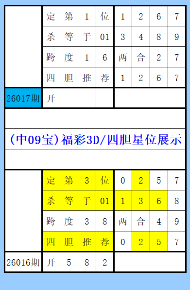 四胆1、2、6、7。在福彩3D百位数字选择中,推荐四个数字旨在覆盖较高概率的冷号反弹区间。数字1在近四期百位完全缺席,是长期冷号,遗漏期数增加后存在理论回补空间。数字2同样长期未出,冷态持续,可能随整体数字分布调整而表现。数字6在近四期百位未出现,作为中间数,在近期大数热出(如数字5、8)的背景下,其相邻区域数字可能受到带动。数字7在近四期百位未开出,冷态明显,作为大数奇数,在热号5频繁出现后可能出现转换。从整体走势看,百位数字近期极热与极冷并存,故集合1、2、6、7聚焦于冷号区域,符合冷热转换的常见思路。四胆建议取1-2个,基于统计频率,在大量期次中,百位从四个推荐数字中出现1-2个的概率较高,出现0个或3个的概率相对较低。