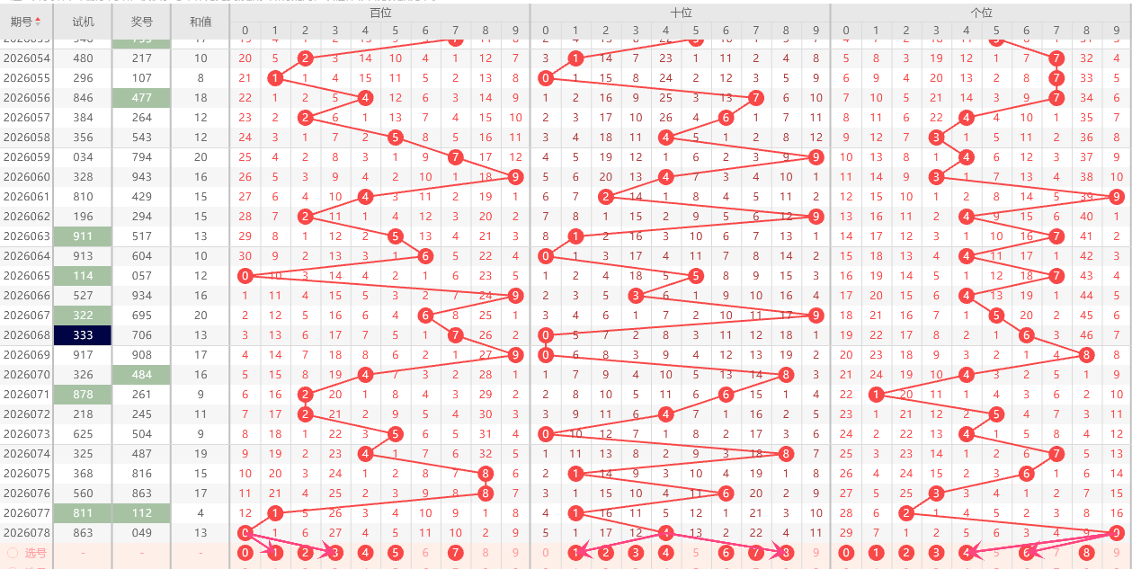 百位上期开出号码0,小数,偶数、百位近5期开出号码为:4-8-8-1-0,从近5期看74期遗漏为3,75期遗漏为32,76期遗漏为0,77期遗漏为21,78期遗漏为12,本期号码关注遗漏号码1、3,大小数走势为小大大小小,大号码走热,本期继续关注小数开出,奇偶走势为偶偶偶奇偶。偶数形态走热,注意偶数开出。本期百位推荐0-1-2-3-4-5-7,