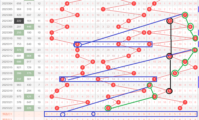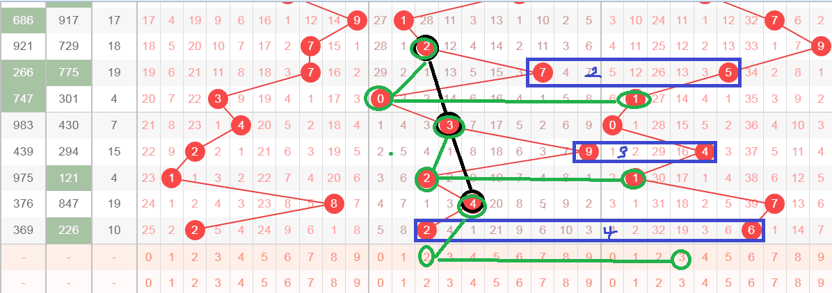 这是一张十位等距走势分析图,在十位出现了黑颜色2,间隔两期出现了黑颜色3,再间隔两期出现了黑颜色4,我们发现在每个黑颜色坐标下期十位和个位的两个蓝颜色不管加或者减都和坐标有关系,第一次坐标2的下期蓝颜色框出现了7和5,两个数字相差等于2,第二次坐标3的下期蓝颜色框出现了9和4,这两个数字相加等于13,也就是3,和坐标3有关系,那么我们昨天已经推算出坐标4的下期蓝颜色 框无论加或者减都等于4,结果出现了蓝颜色框2和6,两个数字相差等于4,那么轮到今天绿颜色,我们发现绿颜色2间隔一期后出现了0和1,形成了012的顺子,绿颜色3间隔一期后出现了21,形成了123,那么今天绿颜色4要是形成顺子的话,只有234,345,456,得到的两码组合是23,35,56三个组合,文字表达可能不太清楚,大家可以观看上面的视频