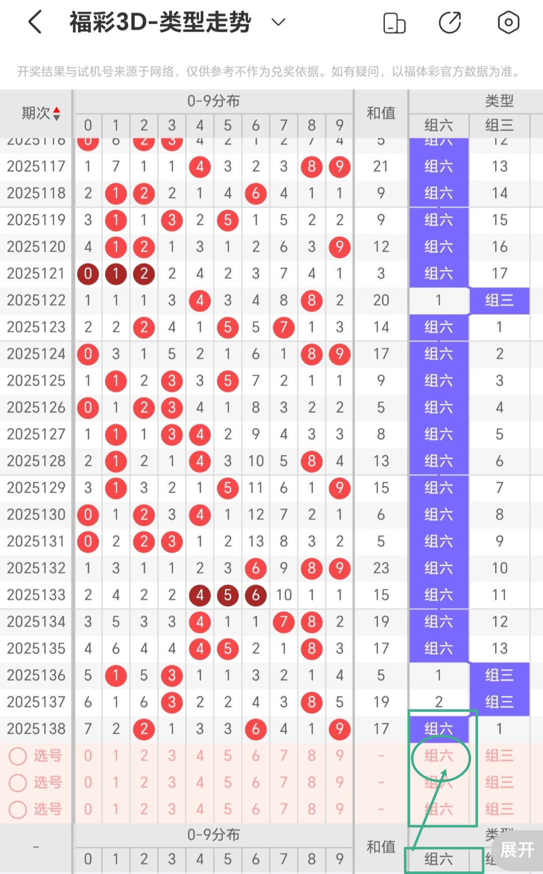 从走势趋势来看,组六类型近期活跃度较高,频繁现身开奖结果中,形成了较为稳定的出号节奏。与之形成鲜明对比的是,组三与豹子类型近期表现低迷,活跃度降至冰点,在最近一段时间内鲜少出现。根据彩票开奖的冷热交替原理,结合当前的走势形态,短期内组三、豹子类型缺乏回补动力,预计在最近两期内难以出现反转态势。因此,综合多方面因素考量,2025139期开出组六类型奖号的可能性极高。