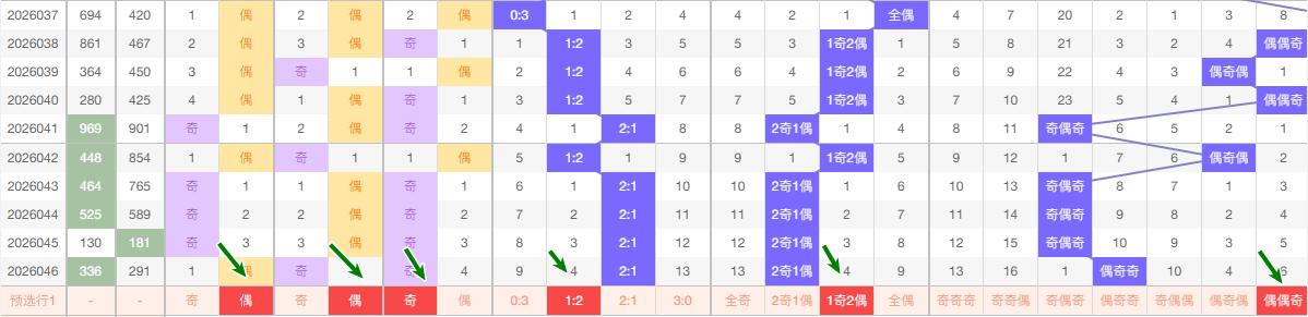 (二)、奇偶分析 奇数 13579 偶数 02468 在这5期 数据中 奇数出现 9次 偶数出现 6次 从昨天出号来看奇数占优, 本期还是看好奇数有号 看好 奇偶偶 偶偶奇