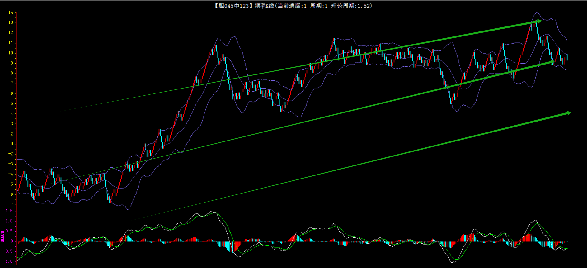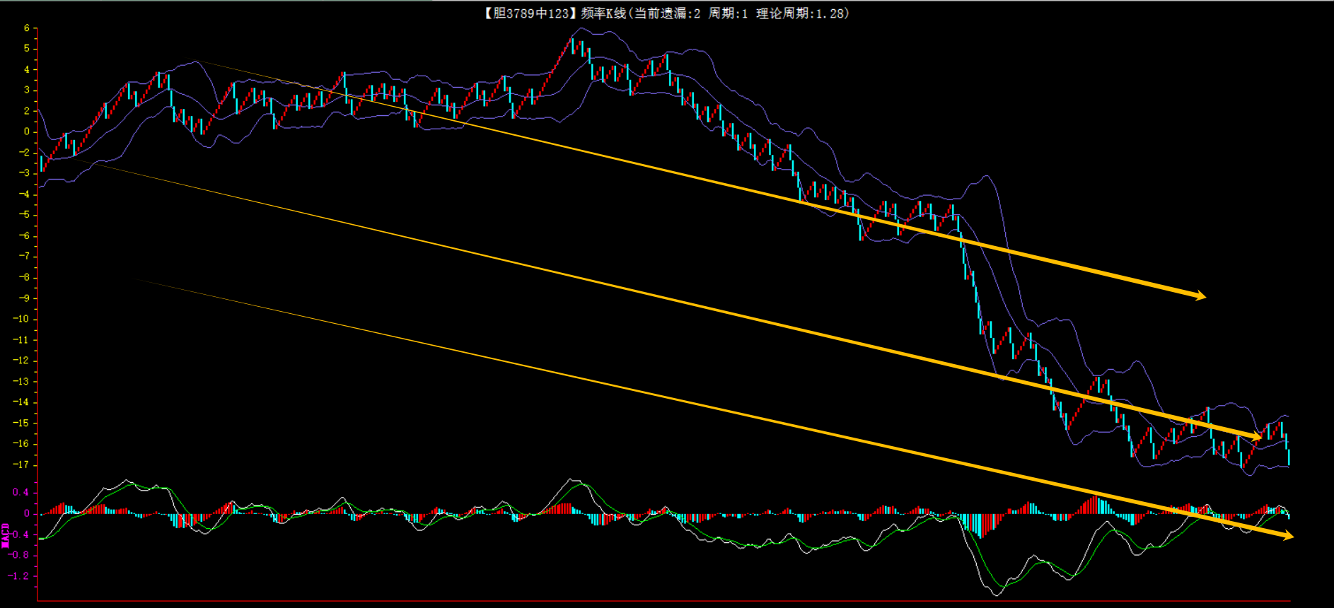 整体趋势下行,上边沿线趋势向下,下边沿趋势也是向下,节点震荡,当前遗漏2期,本期防守。