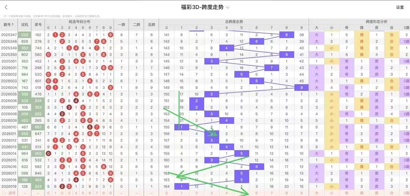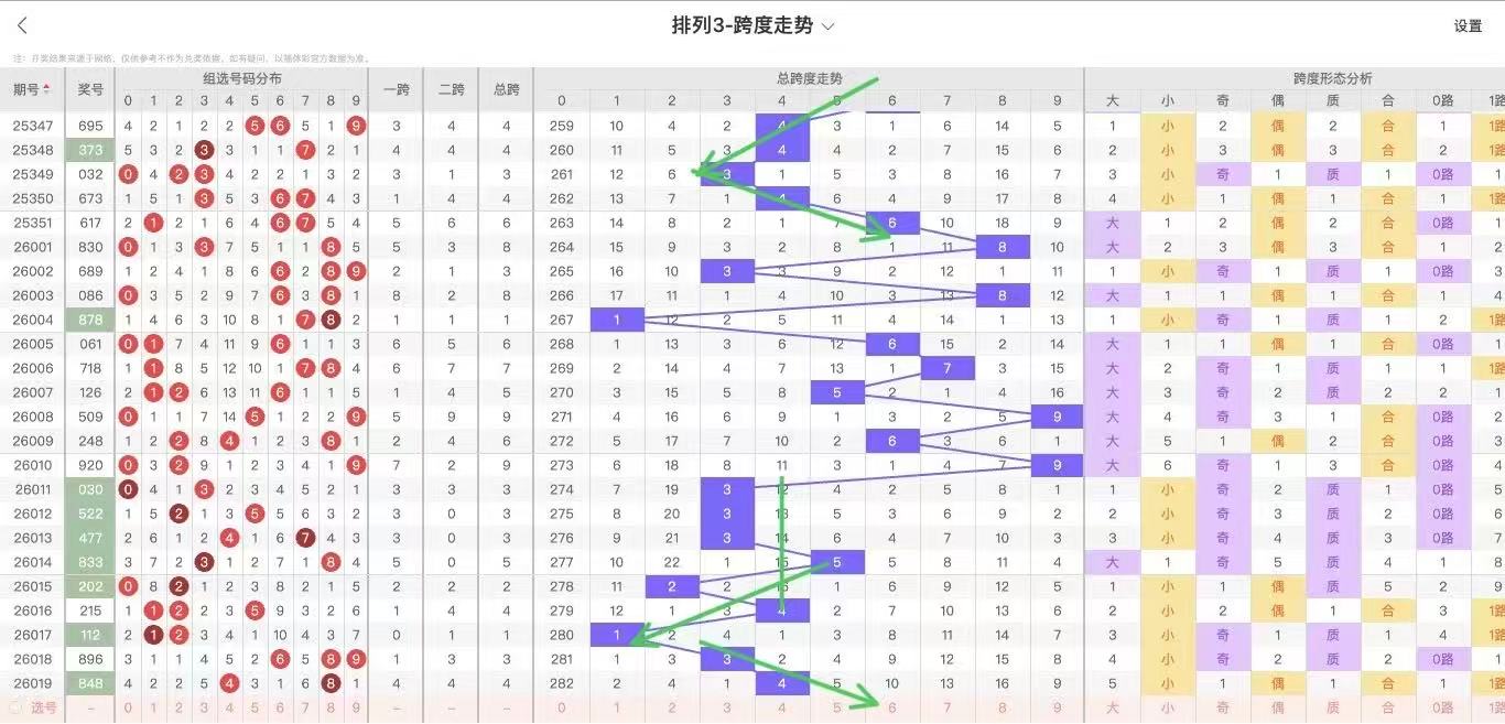 10期内跨度走势为:9-3-3-3-5-2-4-1-3-4,10期内大小跨比为2:8,奇偶跨比7:3,百期内跨度4共开出9次,下期数据:6 5 9 5 4 3 6 1 近期度较热,考虑跨度4开出后容易出大跨度,近期大小规律下大:奇:质,所以接下来继续大跨,奇跨度表现!