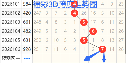 2)我们来看跨度:还是以102期——106期为例,如图依次是45657跨度,按照路数转换关系来看,那么跨度我们暂定147258跨 ,本期个人比较看好5 7 4跨。