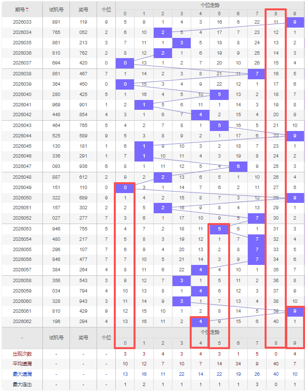 上期个位:4,近10期个位出号:5 7 7 7 4 3 4 3 9 4。最近10期大小变化分别:大大大大小小小小大小,奇偶变化分别:奇奇奇奇偶奇偶奇奇偶,质合变化分别:质质质质合质合质合合,根据近10期规律本期综上所述个位出号推荐5个号码:0 4 5 8 9。