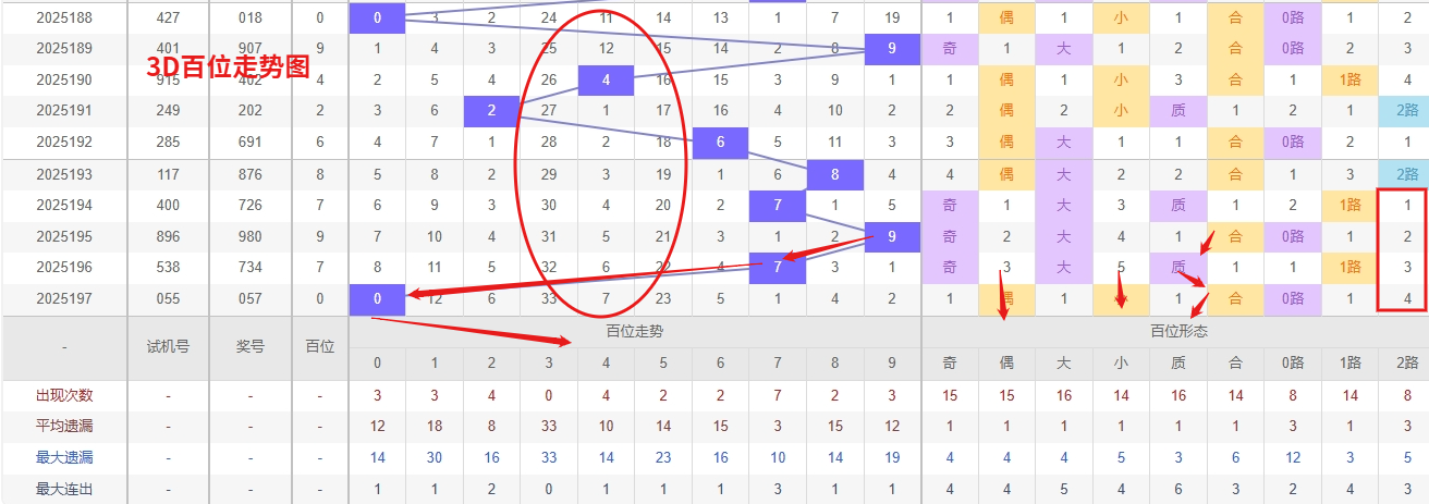 福彩3D百位分析:第2025197期百位开出号码0属于小偶数,从上面百位走势图上可以看出近100期大小比约为51:49奇偶比约为55:45。近期数据还是比较极端的符合文章开头介绍的求均衡规律非等量现象。但这种均衡不会持续最终会被偏态运行打破,然后循环往复。但短期内大小相差7点,大数过热小数有回补需求本期个人认为走小数的概率更高。上期百位落号“0”号球,在百位号码开出0路号码0后向小数方向走出7个振幅。那么通过分析上期百位落位号码分析,号码走出7个振幅,号码走为小偶数,开出0路号码0。通过对百位落号趋势来分析,百位号码落位前端,通过对近10期的走势来看百位号码大小交替频繁走2期大数又走3小数,最近大数比较强势,本期有走向大数号码的概率。那么本期我们在对百位号码进行分析时我个人的考虑百位号码会走出大数号码球,近期3D百位走势中,数字3作为冷号已经连续遗漏33期未出,冷态明显,需重点关注其回补的可能。与此同时,数字9作为热号近期频繁开出,热度持续攀升,短期内仍需防范其再次现身。在选号时,建议冷热兼顾,一方面可适当关注冷号3的反弹机会,毕竟长期遗漏后回补概率逐渐增大;另一方面也要警惕热号9的持续走强趋势,避免遗漏追冷而错过热号连开的机会。我们在百位关注的重点在13569这5个号码球上,百位号码近期奇偶切换频繁,0号球码属于0路号码偶数,现偶数开出过多有向奇数的趋势。所以福彩3D第2025198期百位看好13569。本文由一起彩钱是生命动力所著,请勿转载