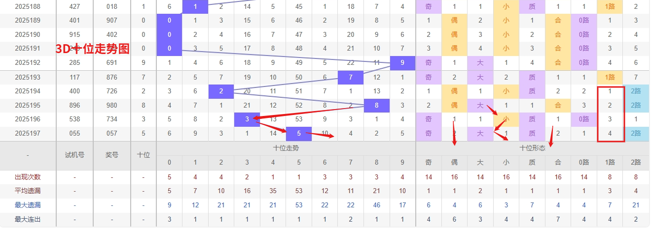 福彩3D十位分析:第2025197期十位开出号码5属大奇数号码后端。以历史100期数据为例十位奇偶比约为47比53,大小比约为54比46近期大小相差2点,根据求均衡的规律开出大数的概率比小数高一点。上期我们分析偶数经过连续回补后有走奇数的可能,开出奖号5大奇数符合我们的预期。从3D十位走势来看,数字5虽然刚刚开出,但此前经历了较长时间的遗漏,冷态回补的动能较强,存在连开或短期内重复出现的可能,值得重点关注。而7和8作为温号近期表现稳定,出现频率有所上升,呈现出转热的迹象,尤其是7在间隔几期后可能再次发力,8也有望进入热号行列,需要提前防范。在选号策略上,可以优先考虑5的连开机会,同时兼顾7和8的升温趋势,适当搭配组合。所以福彩3D第2025198期十位推荐25678。本文由一起彩钱是生命动力所著,请勿转载
