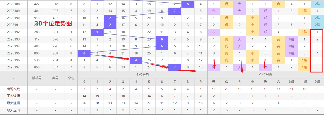 福彩3D个位分析:第2025197期个位开出号码7属于大奇数后端,从以上个位走势图中可以看出近100期的大小比约为54:46奇偶比约为55:45大小奇偶数据上有点差异有需求但不是太明显,不太好看这时就要借助连线走势和遗漏数据来帮助我们缩水号码。上期个位落号“7”大奇数1路号码球,号码开出了3振幅,连续多期的大振必被小振幅取代幅符合我们的预期,那么本期我们在个位考虑振幅走势走前依然要转变思路考虑大振幅,具体考虑(1-5)个振幅是我们主要的方向,那么在对个位落号情况进行系统的分析时我们可以明显的看到个位号码走势呈现大范围震荡,尤其是在号码的落位特点上表现的尤为突出,那么本期我们在个位分析时就要注意号码的风险,避免出现踏空。从3D个位走势来看,数字5和9近期表现较冷,尤其是5已经多期未出,冷态明显,存在较强的回补需求;而9虽然遗漏期数略短,但也进入冷号范围,需关注其可能的反弹机会。与此同时,数字8作为热号近期频繁开出,热度居高不下,短期内仍需重点防范其持续走强的可能。在选号时,冷热结合,一方面可适当布局冷号5和9的回补,尤其5的遗漏值较高,反弹概率较大;另一方面也要紧盯热号8的走势,因此福彩3D第2025198期个位看好35189。本文由一起彩钱是生命动力所著,请勿转载