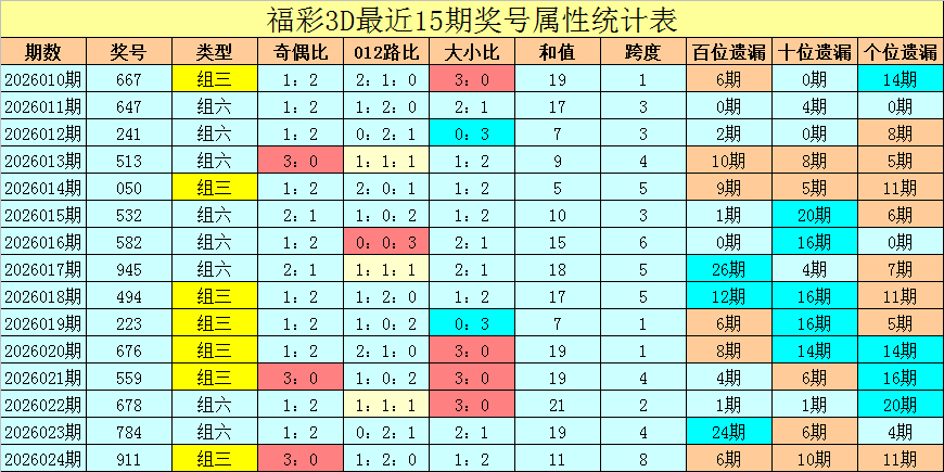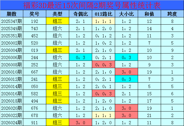 福彩3D第2026024期奖号为911,奖号组选类型为:组三,012路比为1:2:0,奇偶比为3:0,大小比为1:2,和值开出11,跨度开出8。