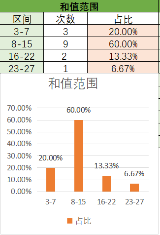 上期和值是11,处在8~15之间,其中8~15占比变大,16~22占比变小。目前是8~15的和值占比是最多的,优势是最好的次之是3~7,然后是16~22,最后是23~27。本期看好和值在8~15之间,其次是16~22