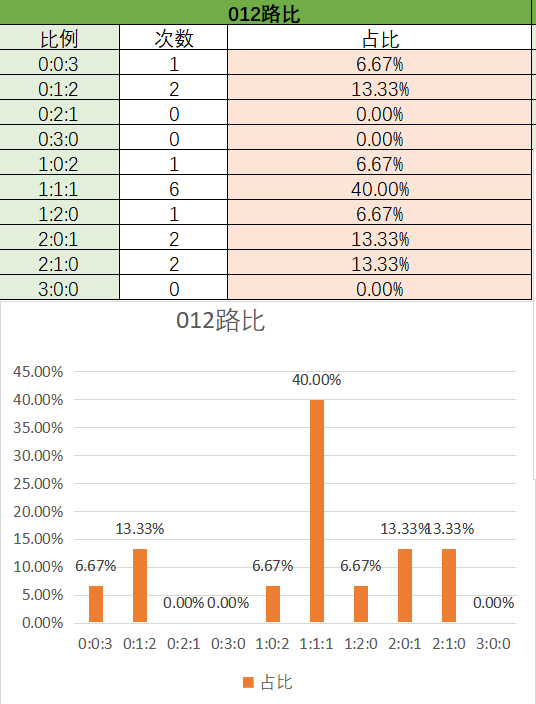 上期012路比是1:2:0其中1:2:0占比变大,0:2:1占比变小。近15期内,1:1:1是开出最多的,然后是2:1:00:1:22:0:1,最后是1:2:01:0:20:0:3总的看0最热门其次是1路,最后是2本期看好1:1:10:2:1