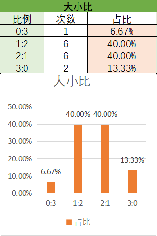 上期大小比为1:2,其中1:2占比变大,2:1占比变小。可以看到近15期内2:11:2优势最好的然后是3:0最后是0:3。本期看好2:1开出,其次是1:2
