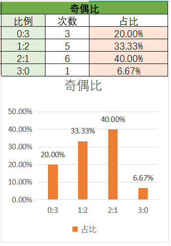 上期奇偶比为1:2,各个类型占比没有变化。近15期内2:1优势最大,其次是1:2,然后是0:3,最后是3:0上期开了1:2奇偶比,本期看好2:1奇偶比的开出,其次是1:2