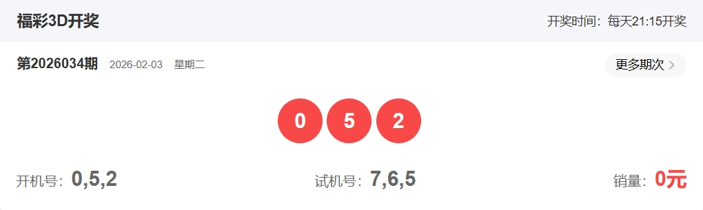 福彩3D第2026034期开奖052