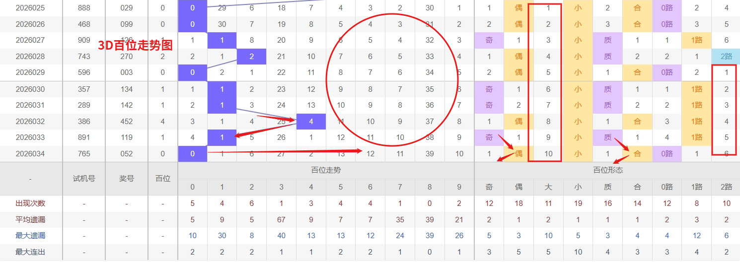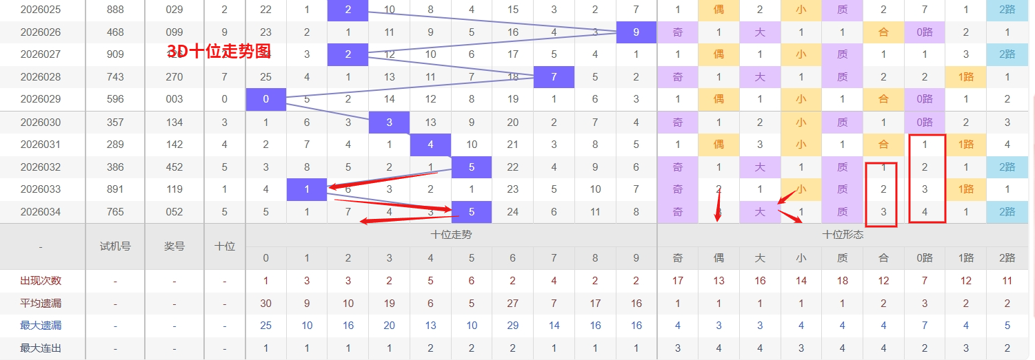 福彩3D个位分析:第2026034期个位开出号码2属于小偶数前端,从以上个位走势图中可以看出近100期的大小比约为53:47奇偶比约为55:45大小奇偶数据上有点差异有需求但不是太明显,不太好看这时就要借助连线走势和遗漏数据来帮助我们缩水号码。上期个位落号“2”小偶数2路号码球,号码开出了7振幅,连续多期的小振必被大振幅取代幅符合我们的预期,那么本期我们在个位考虑振幅走势走前依然要转变思路考虑大振幅,具体考虑(2-6)个振幅是我们主要的方向,那么在对个位落号情况进行系统的分析时我们可以明显的看到个位号码走势呈现大范围震荡,尤其是在号码的落位特点上表现的尤为突出,那么本期我们在个位分析时就要注意号码的风险,避免出现踏空。近期3D个位走势呈现明显的冷热分化:号码4近期频繁开出,形成持续热态,表现出较强的连开惯性,短期内仍有继续走热的可能;与此同时,号码8已进入较长的遗漏周期,冷态特征显著,根据冷热转换规律,需密切防范其解冻回补。因此福彩3D第2026035期个位看好03578。本文由一起彩钱是生命动力所著,请勿转载